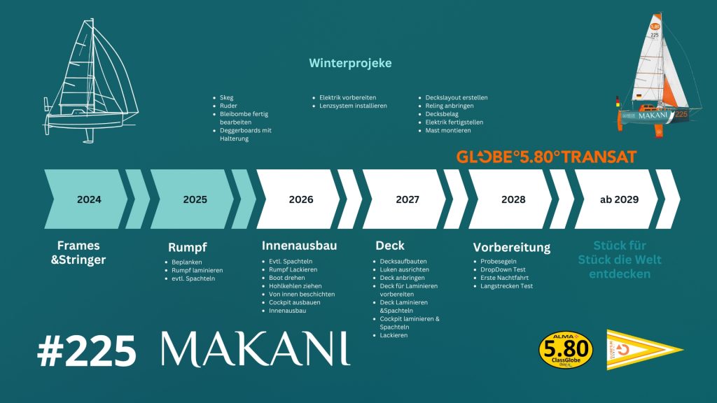 Wir sind Simone und Tobias aus Tauberbischofsheim – weit weg vom Meer, aber mit einem Herzen, das seit Jahren für Segeln und Abenteuer schlägt. Unser größter Traum: Mit unserem selbstgebauten Segelboot „Makani“ beim Globe 5.80 Transat 2028 den Atlantik überqueren.